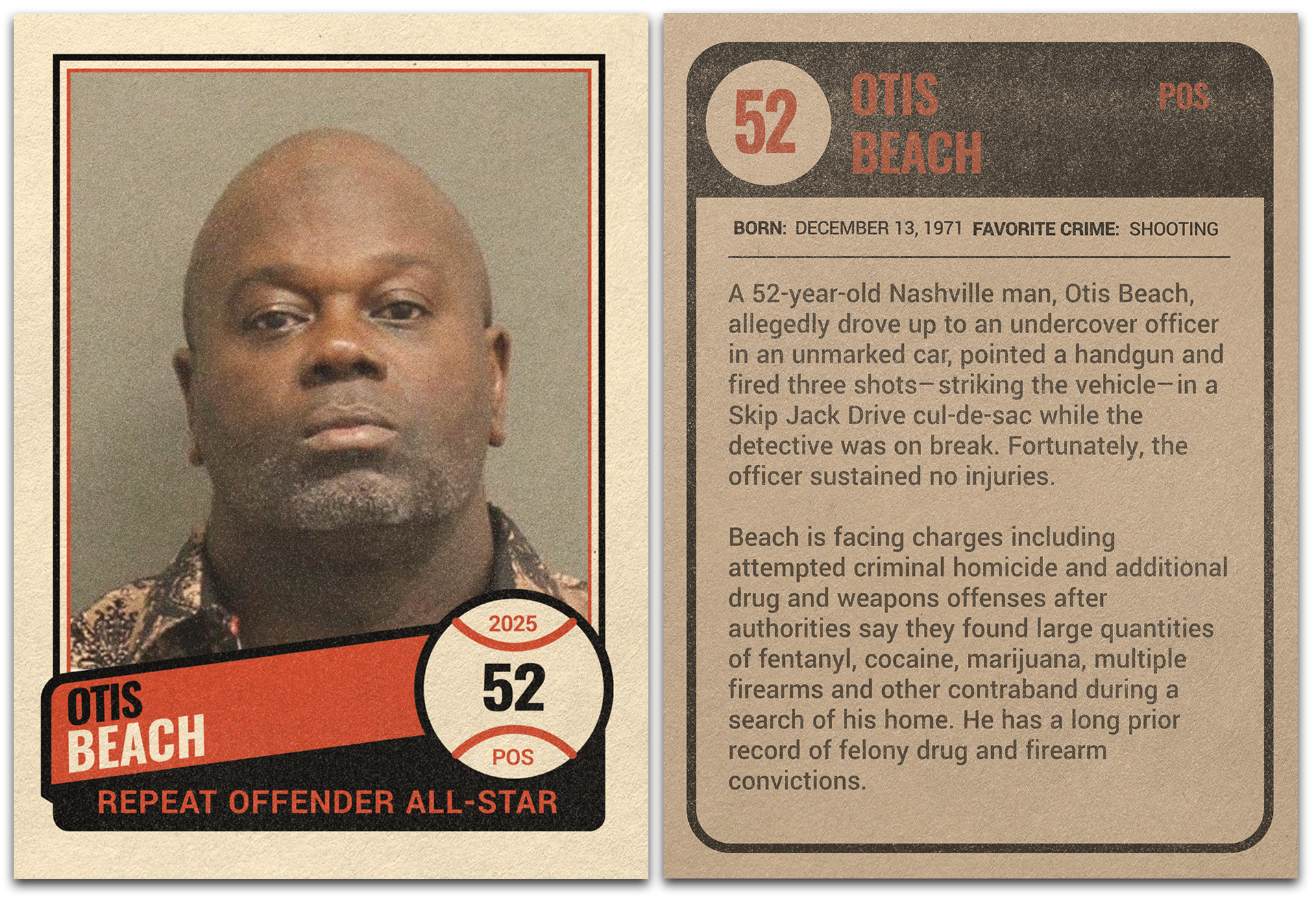Most recently, he pulled up on an undercover cop and pointed a gun at him. The officer did the wise thing and left the scene, but Beach fired three shots as he fled, hitting his car at least once. Unsurprisingly, MNPD soon arrived on the scene in full force and discovered 3.4 pounds of marijuana, 4.73 pounds of cocaine, and a whopping 33.55 pounds of fentanyl. (More Info)