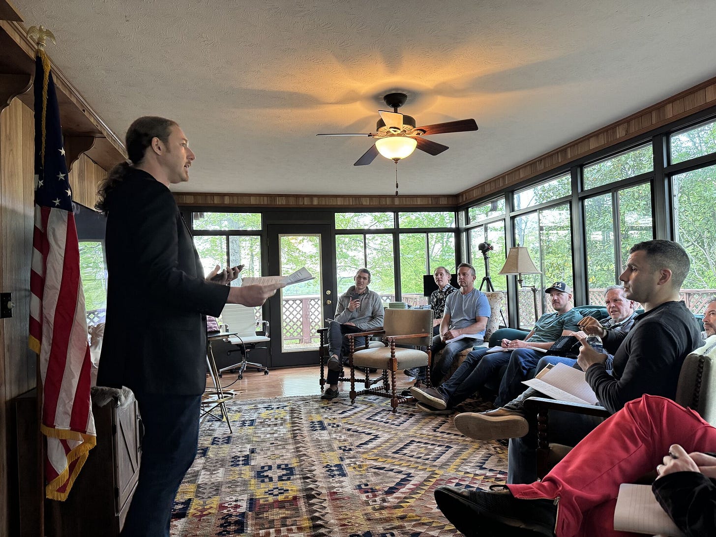 At this time, Meriwether was just getting started. I was inspired by Steury's vision, which, beyond hosting men’s events, includes founding a school for boys dedicated to classical and outdoor education—something like a cross between Plato’s Academy and the Boy Scouts, as he puts it.