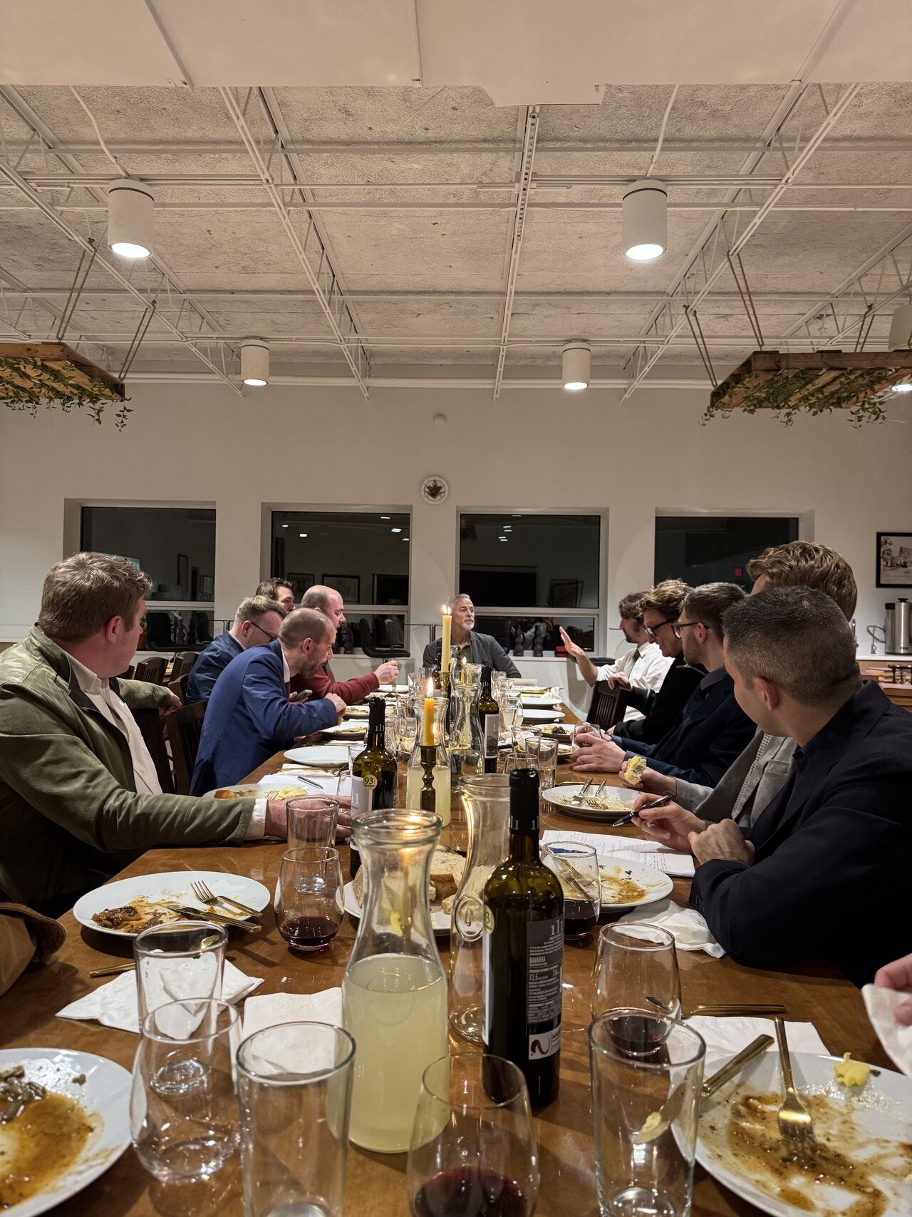 In addition to outdoor retreats, Meriwether hosts monthly philosophy dinner symposiums in the city, each following this Jeffersonian format. This week’s guest was Belmont professor Mark Anderson. Western philosophy has been driven, he explained, by the battle between two philosophical concepts: being (represented by Plato) and becoming (represented by Nietzsche). We spent nearly three hours asking him questions and discussing the practical implications of this philosophical debate. In particular, how the suppression of being today partially explains the ills of modern society.